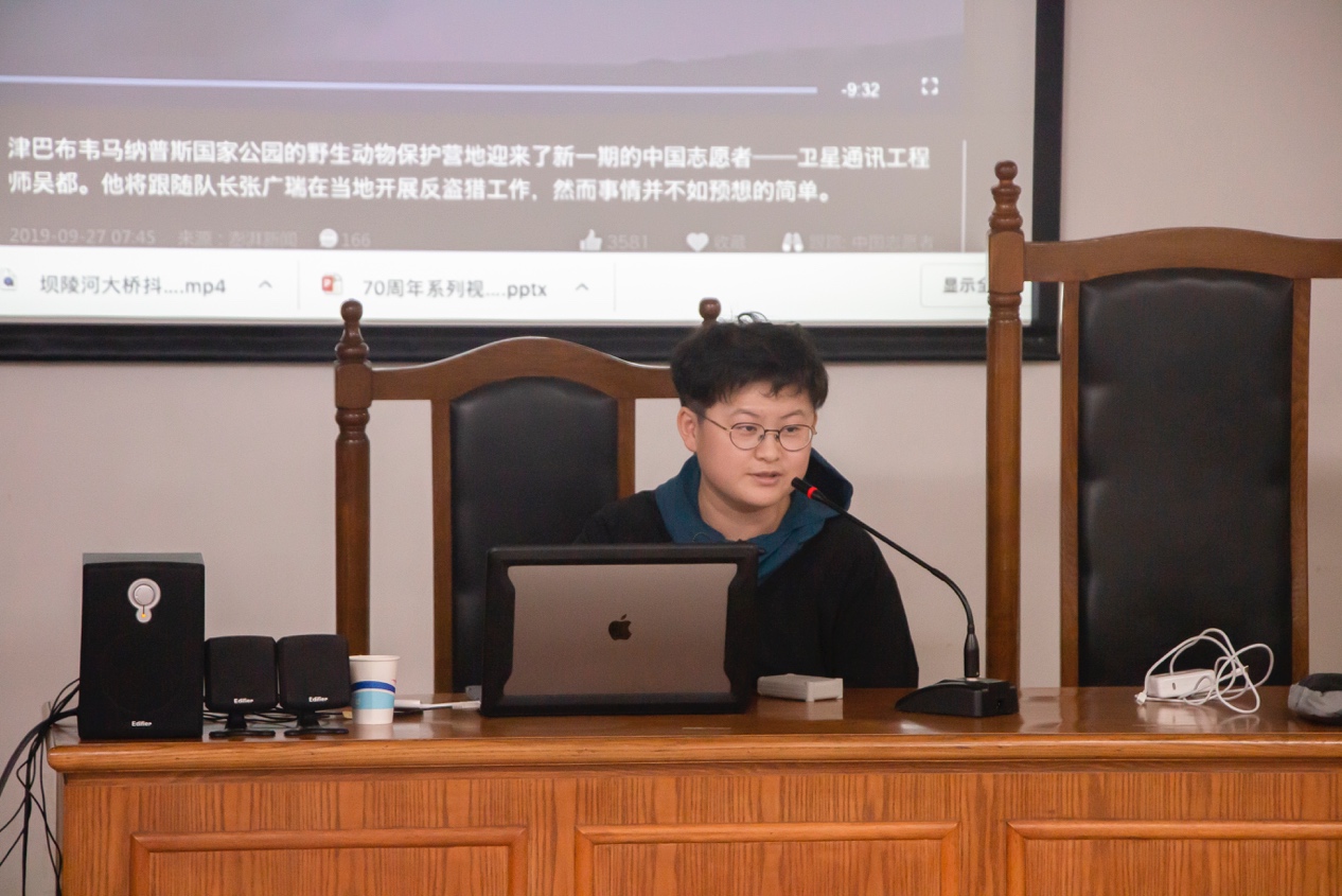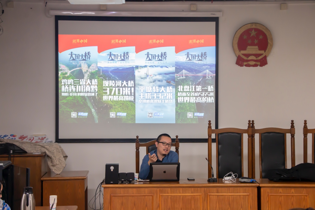 讲座伊始,澎湃新闻原创视频部副总监徐晓林向同学们简单介绍了澎湃新闻原创视频的组成部分和各个栏目,涉及经济、科技、社会等各个层面。在介绍的过程中,徐晓林副总监也对部分短视频进行了展示,引起同学们的关注与兴趣。徐晓林副总监指出,在现在这么一个快速发展的时代,人们更愿意观看“短而精”的视频,这也是原创视频部着重发展短视频制作的重要原因之一。今年恰逢祖国母亲70周岁,澎湃新闻原创视频部特意制作了“70周年”主题原创视频——《大国大桥》和《中国志愿者》,本次讲座也正是围绕这两个系列的报道思路进行展开。
