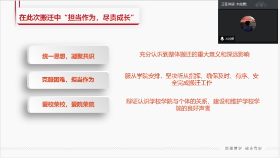 老师们通过此次主题大会引导学生统一思想、凝聚共识,服从学院安排,坚决听从指挥。在校区搬迁的考验中,杜绝“躲进小楼成一统”逃避责任的思想和行为,要克服困难,在担当中历练,在尽责中成长,体现出新时代青年的责任和担当,积极配合学院,及时、有序、安全完成搬迁工作。要辩证认识学校学院与个体的关系,爱校荣校、爱院荣院,始终与学校学院荣誉与共,建设和维护好学校学院良好声誉。