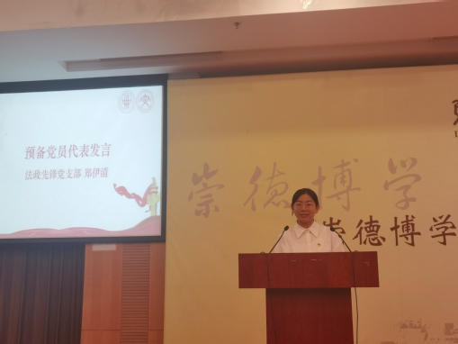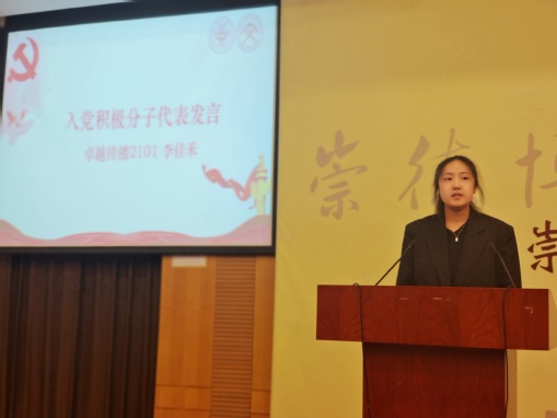 李佳禾作为入党积极分子代表发言,她从学而真信,筑牢“风雨多经志弥坚”的理想信念;学而善思,铭记“俯首甘为孺子牛”的初心使命;学而力行,锻造“敢叫日月换新天”的干事本领三个方面表明自己牢固树立信念,不断摸索,常修常练、常悟常进的决心并与大家共勉。郑伊清作为预备党员代表发言,她带领大家一起回顾了上海疫情期间,所有同学以“满格”状态,坚决贯彻“动态清零”总方针,以一域之力尽全局之责,彰显出勇毅笃行的担当精神。并结合自身实践经历,呼吁同学们端正学习态度,努力学习,严格遵守党校纪律,进一步提高自己的思想水平和政治素质,并自觉将所学知识运用到实践之中。