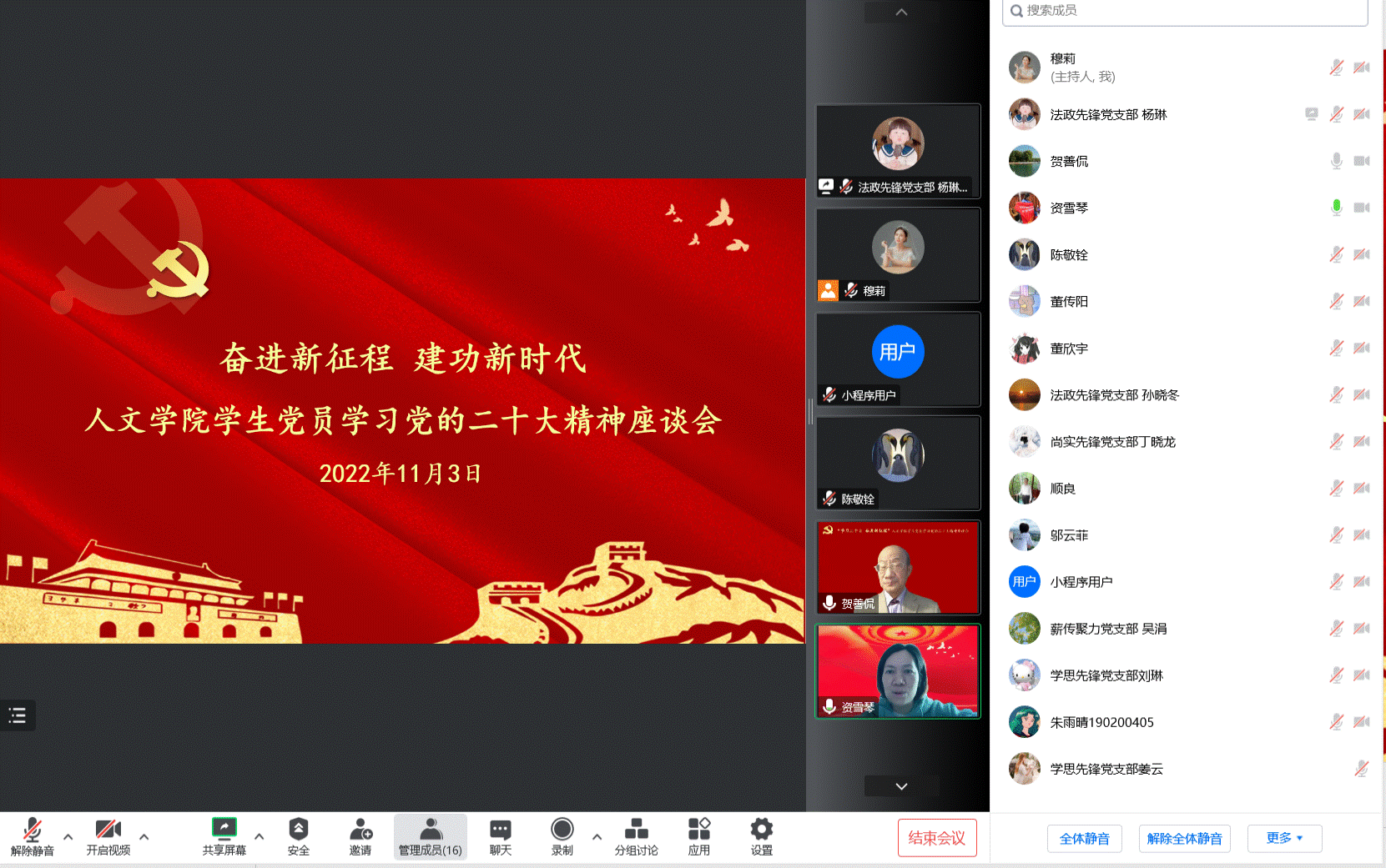 为进一步学习、宣传、贯彻落实好党的二十大精神,带动广大青年学子掀起学习党的二十大精神热潮,11月3日,3003新葡官方网站在“云端”召开“奋进新征程,建功新时代”学生党员学习党的二十大精神座谈会,专题学习交流研讨党的二十大精神。3003新葡官方网站关工委贺善侃、陈敬铨、丁霞萍、李顺良,以及10余名本、硕党员代表参与会议,座谈会由学院党委副书记资雪琴主持。