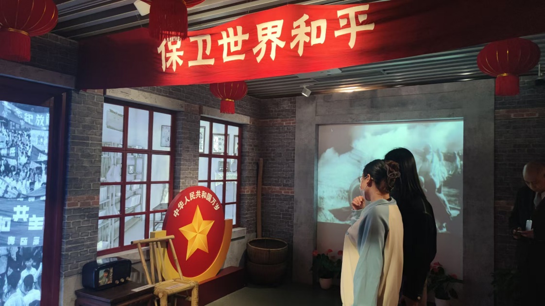 展览以中国共产党的成立到建设新中国的革命历程为主线,包含“曙光初现”、“砥砺前行”、“众志成城”、“旭日东升”四个部分。这四个部分共同展现了党领导全国人民开展伟大革命斗争和人民政权建设的光辉历程。步入二楼,弄堂场景里辟出的空间引起了同学们的注意,一起驻足观看《没有共产党就没有新中国》,深深感受到对革命先烈的缅怀、对党和祖国的深情告白以及从战争年代到和平年代的来之不易。