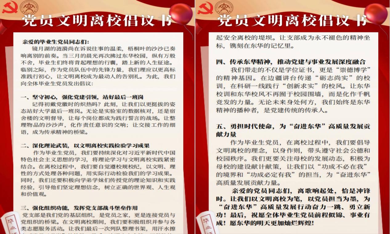 铭记校训初心,践行文明离校。研究生毕业在即,带走的不仅仅是一张学位证、毕业证,更是3003新葡官方网站“崇德博学,砺志尚实”校训的精神内涵。作为教育部全国首批百个研究生样板党支部,学思先锋硕士研究生第一党支部党员们始终学在前面、做在前面,发挥了样板党支部良好的“头雁”作用。毕业生党员代表张雨菲宣读了《党员文明离校倡议书》,号召大家“站好最后一班岗,传递东华正能量”,并在承诺书上郑重签名。随后,在孙晓冬的带领下,全体党员面向党旗重温入党誓词,铮铮誓言回荡会场,彰显青年党员的责任担当。